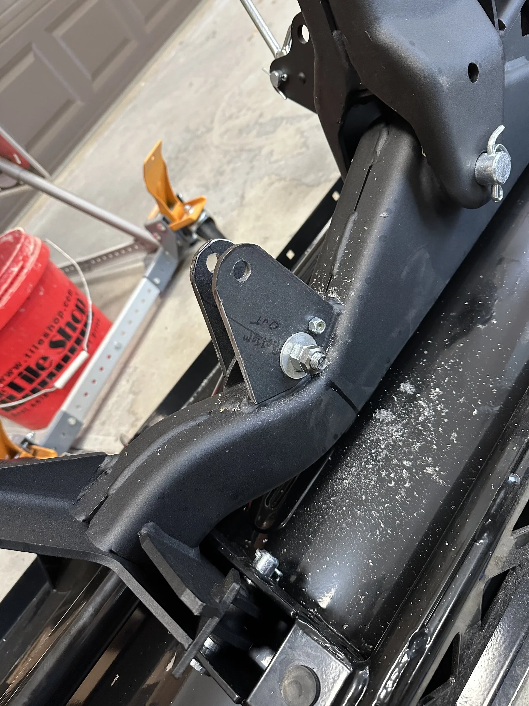 I fabricated two 1/4" thick steel brackets as shown in the pics to ride on the top and bottom of the factory brackets attached to the Glacier frame. I used a 1/2" bolt and nut where the 5/8" locking pin would be, and drilled a 1/4" bolt and nut on the side (only real modification) to make sure the temporary bracket would be rigid in place. The distance from the original pin hole to the new pin hole measures 85mm which allows the plow to swivel completely left and right. When the new hydraulic assembly comes in, it'll be easy to remove my brackets and replace the hydraulic assembly. Hope this idea helps if you have a short actuator!