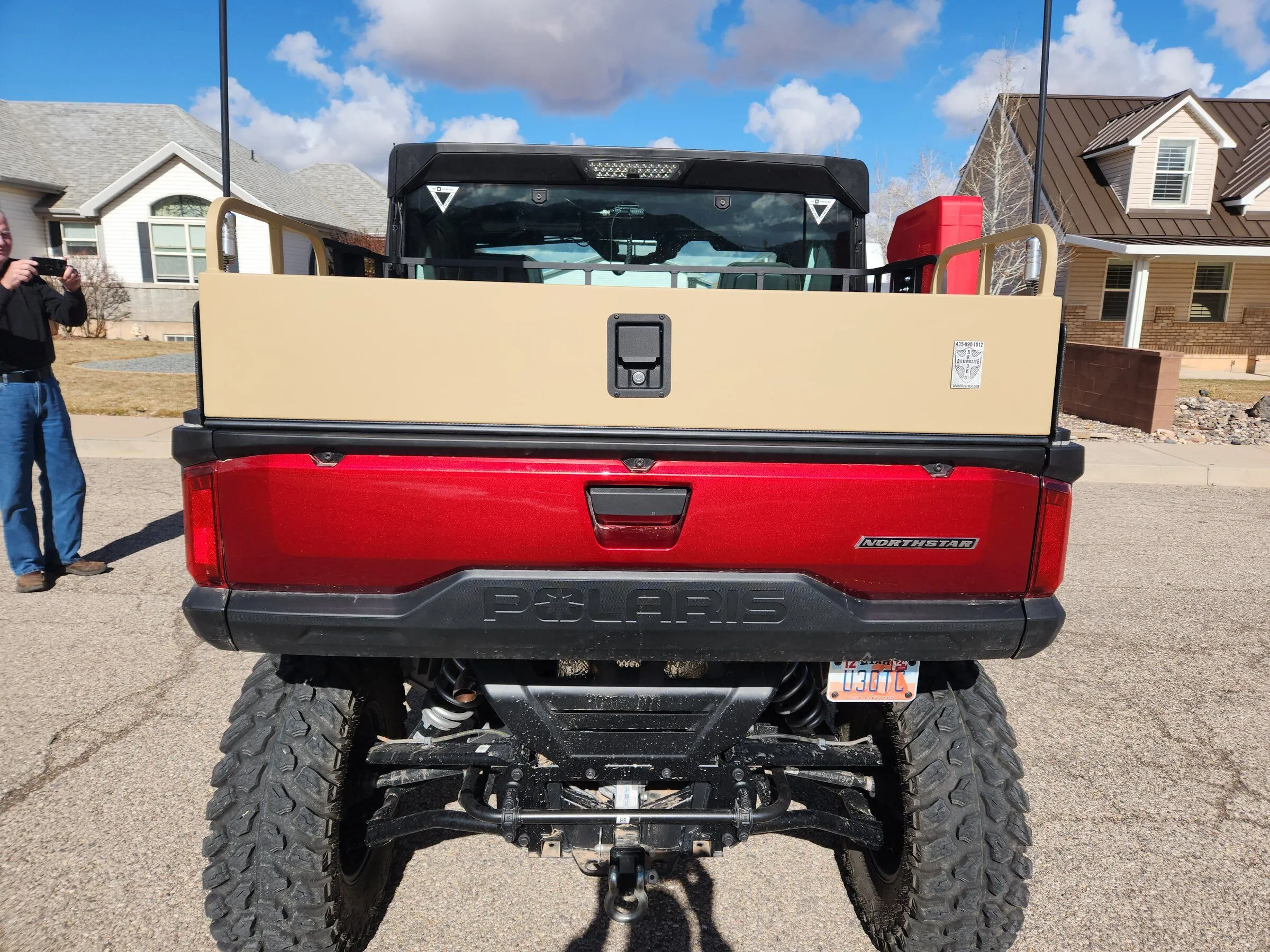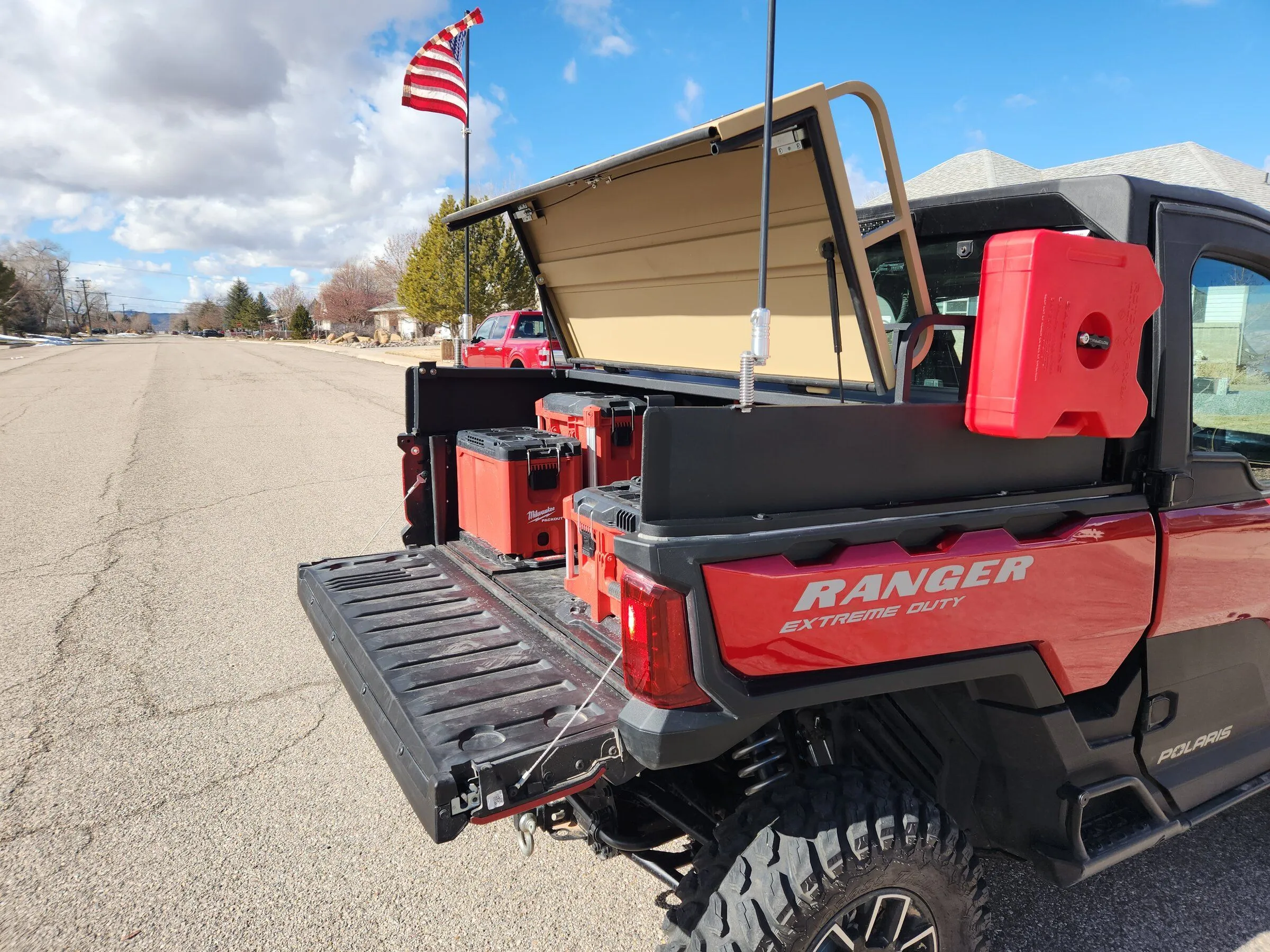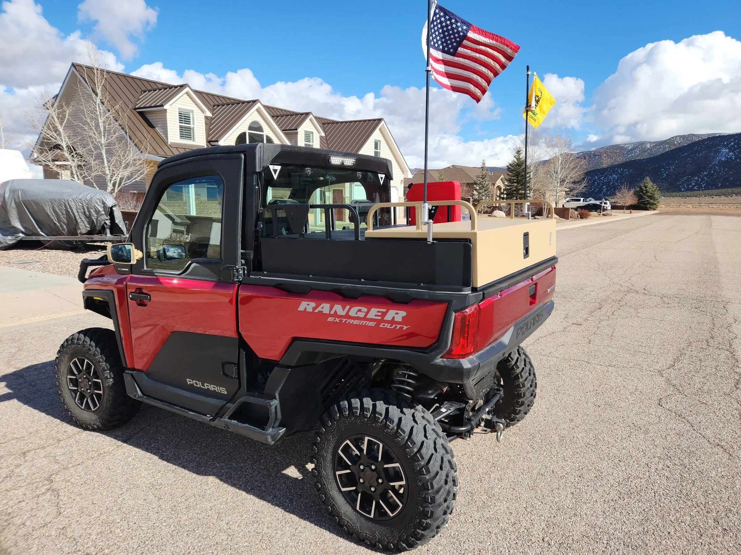 We here at Alumilite Armor Side X Side Enclosures just finished our Bed cover for the 1500 XD. This cover sits and seals on top of the bed rim and anchors to the bed rail. The height of this one pictured has 8" sides. We also offer them in side heights of 3" , 5 1/2", 6 3/4" and 11". These boxes are made from .090 thick aluminum along with 1/8 wall square and rectangle aluminum tubing. We reinforced the top and lid to hold up to 250 LBS and is TIG welded all of the seams. The one pictured is powder coated with black sides and rear top and a desert tan lid. We also installed Roto pax mounting brackets on both sides and flag holder brackets. The lock is lockable and we also provide seal angles to seal the tailgate when closed along with the mounting hardware. We are a custom shop and willing to work with you if you have any specific modifications or requirements. If you want a quality bed cover to keep your gear dry, dust free and built to handle anything you can throw at it we would like to build one for you. If you want additional information and pricing please contact us at 435-990-1012.